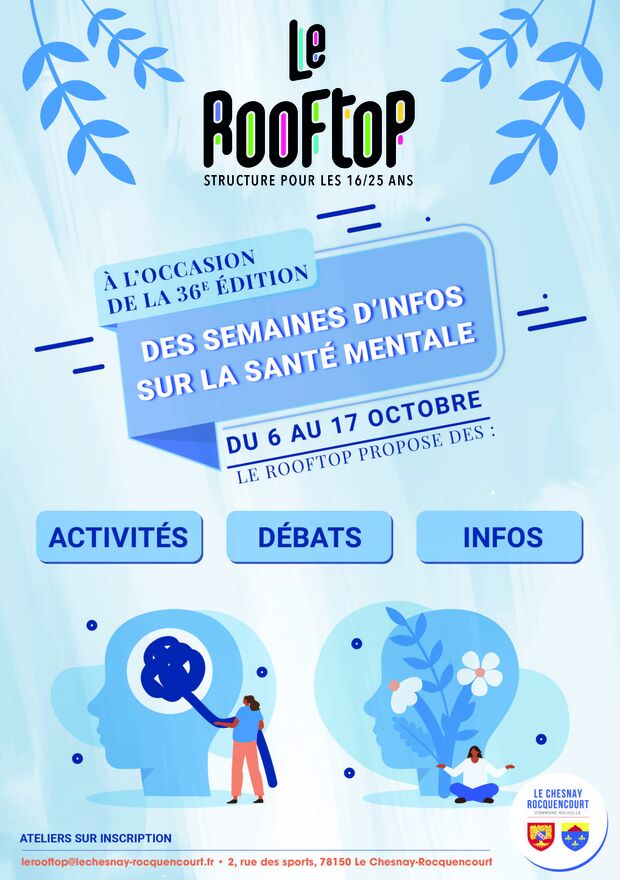 Dans le cadre de la mobilisation nationale des SISM, le Rooftop propose tout un programme associant bien-être et verbalisation : des activités créatives, des temps d’échange, des ateliers bien-être… Pendant ces deux semaines, la structure interviendra également dans des établissements scolaires du Chesnay-Rocquencourt.