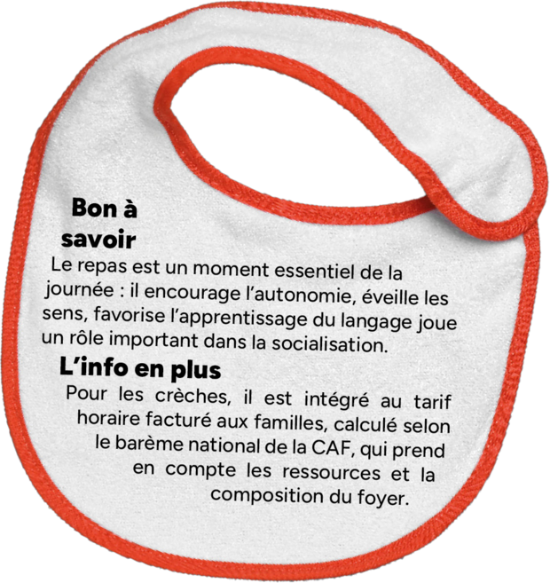 Les textures, les quantités et les compositions sont adaptées à chaque tranche d’âge. Pour les bébés, les repas s’adaptent au rythme individuel de chacun. Pour les plus grands, les repas et les goûters sont servis à heures régulières.