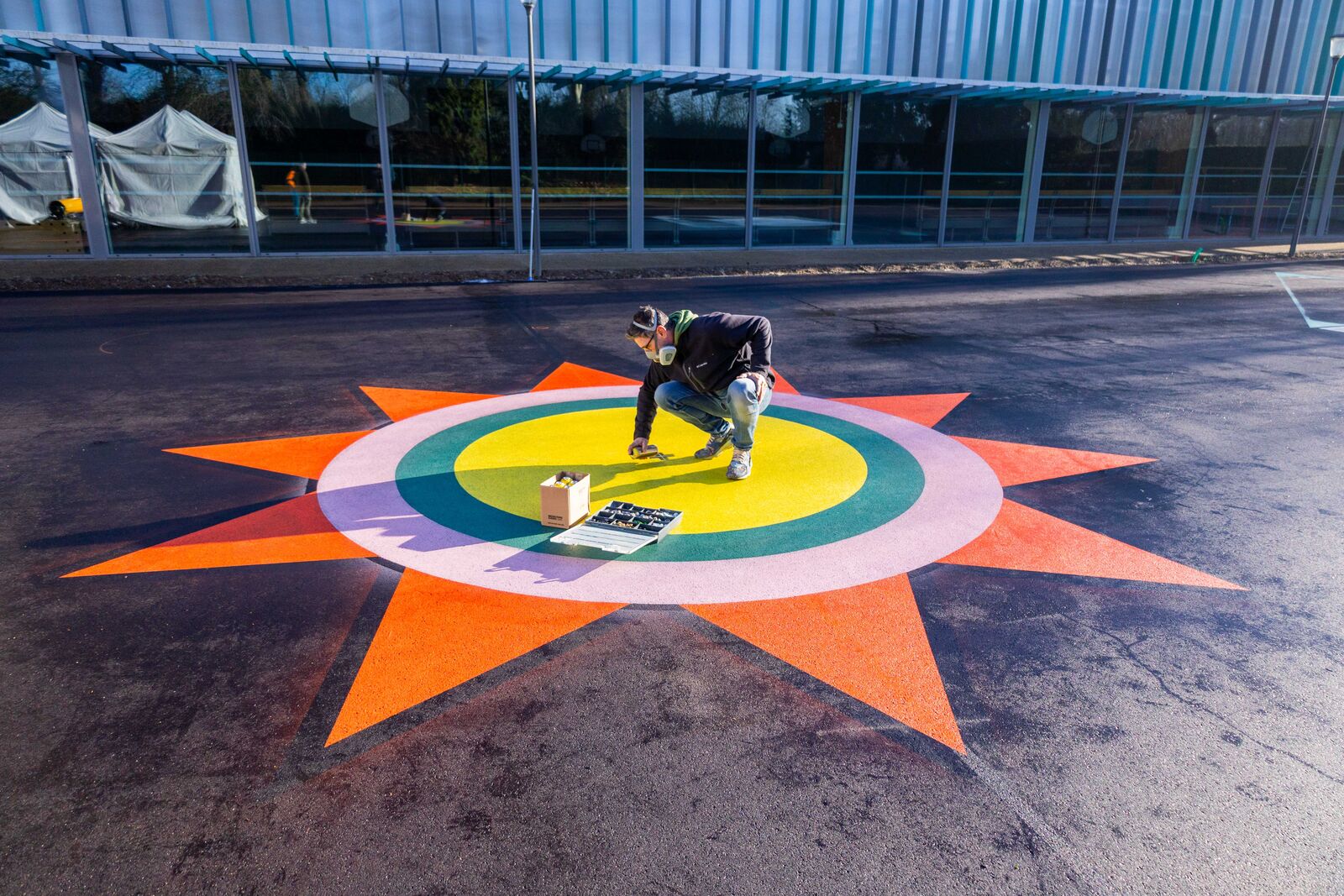 Bien sûr. D’abord les délais avec seulement trois semaines pour tout faire. Il ne fallait pas perdre de temps et je n’ai pas compté mes heures. Ma plus grande peur, au regard de cette période hivernale, c’était la météo et le séchage de la peinture. La mairie s’est montrée très réactive en me prêtant de quoi couvrir le terrain. Heureusement, il a fini par faire beau.